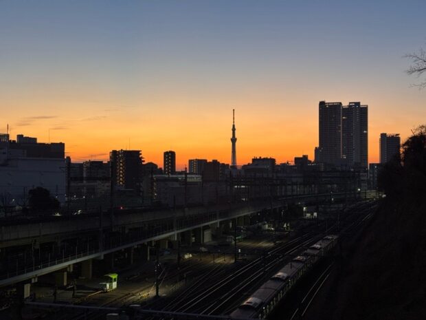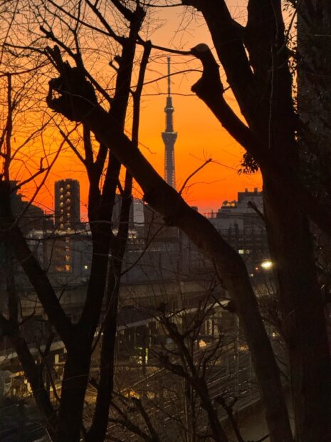 田端ー日暮里はすこし高台を歩くのですが、木々の隙間からスカイツリーが見れました
